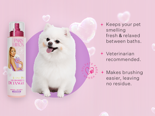 Give your pup the VIP treatment with our Lavender-scented Deodorize & Detangle spritz! This luxurious spray instantly refreshes your dog's coat, leaving it softly scented and totally cuddle-ready. It's like a little spritz of fabulousness that keeps your fur baby smelling divine and looking chic.